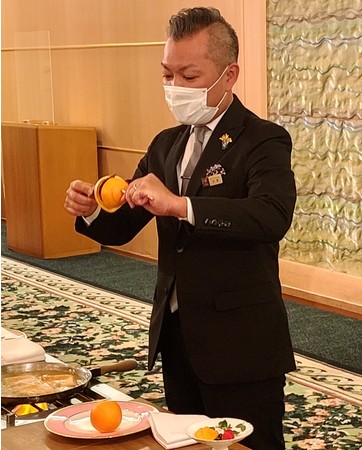 「ロイヤルルーム」での会食では、クラブラウンジの担当者より「茶道の所作」、ソムリエより「ジャンパンサーヴェラージュ」、サービスの担当者より「クレープシュゼット」のパフォーマンスがあり、初めて目にする学生が多く興味深く見学をしていました。