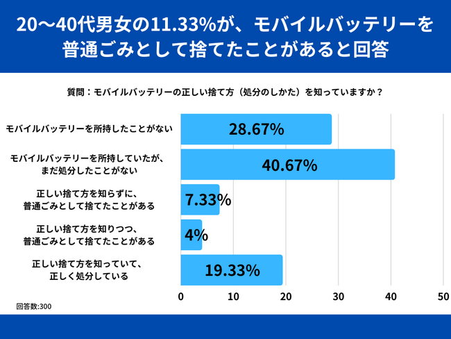 20~40代男女を対象とした「モバイルバッテリーの正しい捨て方(処分のしかた)を知っていますか?」というアンケートで最も多かった回答は「モバイルバッテリーを所持していたが、まだ処分したことがない」で40.67%でした。