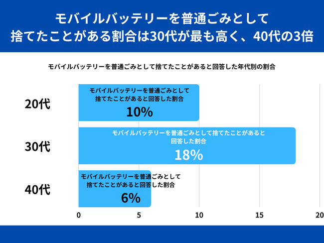モバイルバッテリーを普通ごみとして捨てたことがあると回答した割合を年代別でみてみますと、30代が最も高く18%、次いで20代が10%、40代は6%という結果になりました。