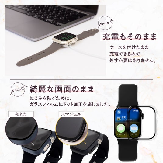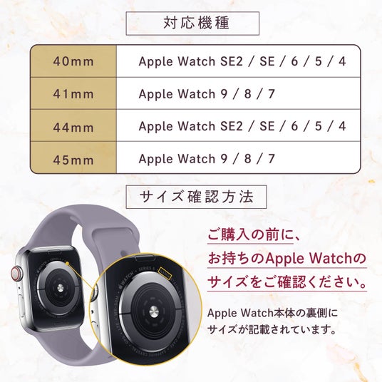 Apple Watch Series 9 / 8 / 7 / 6 / 5 / 4 / SE2 / SE の 40mm / 41 mm / 44 mm / 45 mm に対応。