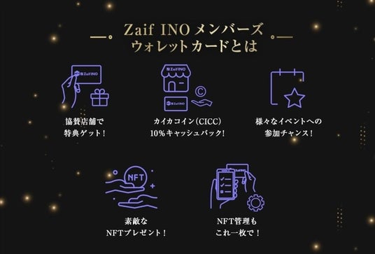 Zaif INOメンバーズウォレットカードを協賛店舗に提示頂くとおトクな特典をGETできる他、Zaif INOでのNFT購入代金の10%相当分のキャッシュバック、オフ会参加申し込み券、NFTプレゼントなど様々な特典付きです!