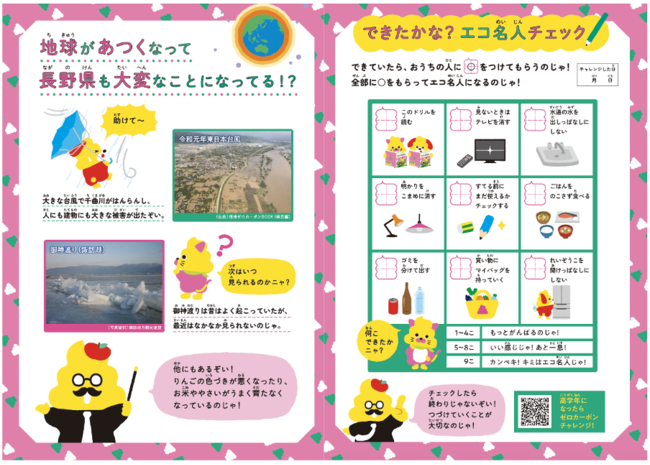 冊子の巻末には、地球温暖化による長野県での被害や影響について学べるページや、地球にやさしい「エコ名人」になるためのチェックリストが。うんこマスに◯をつけてもらいながら、楽しくチャレンジできます。