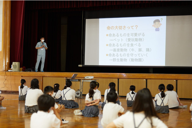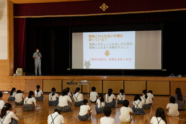 次に、岡本さんは動物の命の大切さ、そしてこの授業を行う背景について生徒たちに講義しました。まず岡本さんは、生徒に「どんなときに命の大切さを感じますか?」と投げかけ、「命の大切さとは様々な考え方があり、絶対にこれが正解というものでもありません。生き物への理解を深めることで育まれるものだと考えています。」と話しました。次に、「昨今、動物を飼っている小学校の数が減っていることや、ペットの室内飼育をする家庭が増えたことから、小学生が動物と触れ合う機会が減ってきています。」と述べた上で、「この授業を通して、動物との正しい触れ合い方を学び、そして動物と触れ合う体験をすることで、命の大切さを考えるきっかけになってほしい」と語りました。