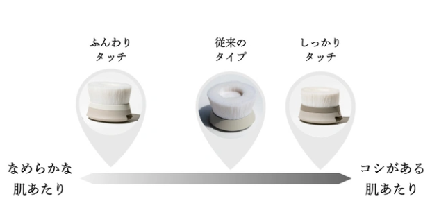 一度で洗える面積を増やし、全身を効率的に洗えるよう改良。「ふんわりタッチ」と「しっかりタッチ」という毛の硬さが選べる2つのタイプをご用意しました。