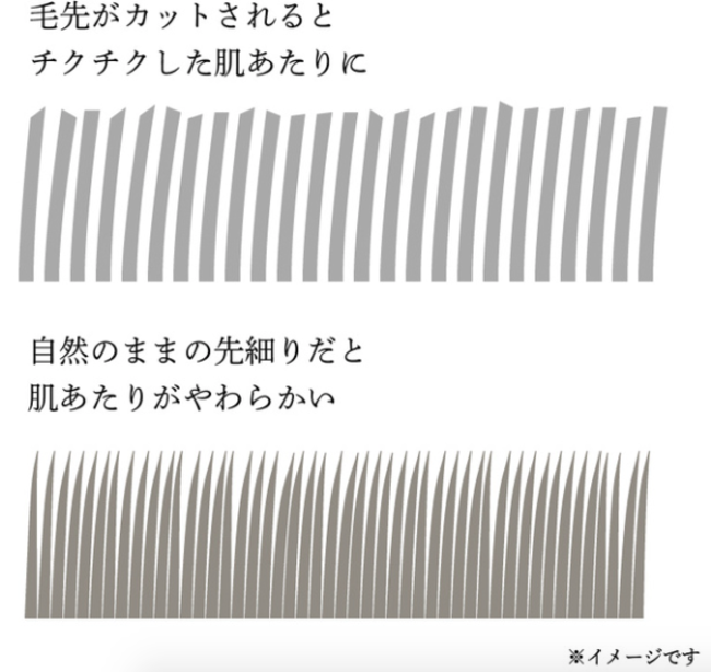 一方で熊野筆は毛先をカットせず、毛の先細り形状を生かせる技術があるため、とてもやわらかでなめらかに滑る肌あたりを実現しています。