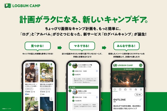 その中で、2024年より提供を開始した『Logbum Camp (ログバムキャンプ)』は、キャンプ旅を「ログ」で、シェアできるサービスがコンセプトで、キャンプの記録・計画を作成し、ユーザー同士でお互いのキャンプの計画・過ごし方・持ち物・グルメ・アルバムなどを共有し合うことができるユーザー参加型のWebサービスです。多様なキャンプスタイルから自分に合ったログバム(計画・体験)を見つけ、それを参考に仲間と簡単にキャンプ計画が立てられる、キャンプ愛好家同士が気軽に楽しく交流できる新しいコミュニティーの場となりました。