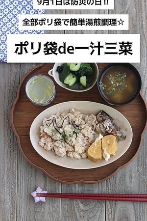 調理道具・方法が限られる災害時に、鍋とポリ袋だけを使用して一汁三菜を作れるアイディアレシピです。食べる時も袋からは取り出さずに器に被せて食べることで洗い物をなくし、貴重な水を節水する工夫が凝らされています。