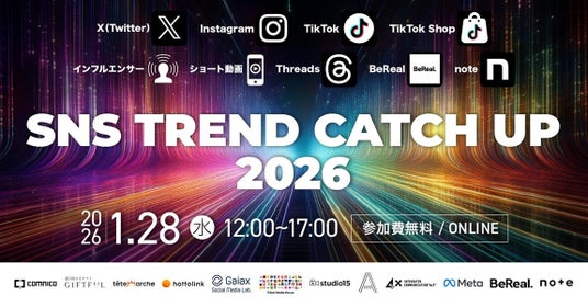 株式会社ラバブルマーケティンググループ(本社:東京都港区、代表取締役社長:林雅之、証券コード:9254)の子会社で、企業のSNSマーケティング支援事業を行う株式会社コムニコ(本社:東京都港区、代表取締役:長谷川 直紀、以下 コムニコ)は、2026年1月28日(水)12時~、オンラインカンファレンス「SNS TREND CATCH UP 2026」を開催いたします。当日は、コムニコをはじめ合計12社が参加し、SNSマーケティングの各領域を牽引する業界トップランナーに加え、SNSプラットフォームを運営する企業の媒体担当者が、「2026年に主流となるSNSマーケティングの潮流」 を徹底解説いたします。