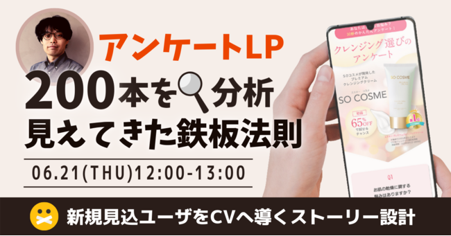 地方を含む日本全国の中小・ベンチャー企業の成長支援をデジタルマーケティング領域で展開するソウルドアウト株式会社(本社:東京都文京区 代表取締役会長CGO:荻原猛、以下ソウルドアウト)は、2022年6月21日(火)にオンラインセミナー「アンケートLPの攻略法(分析結果・事例)を大公開 - 単品通販はもちろん異業種でもヒット中! -」を開催いたします。