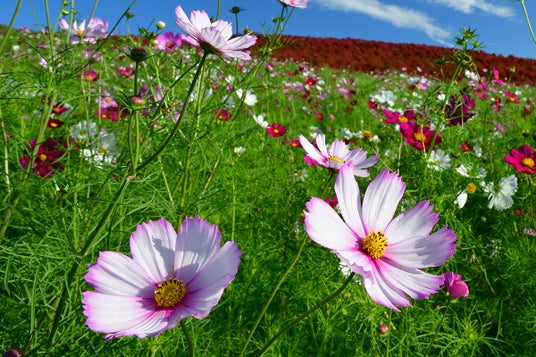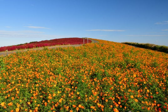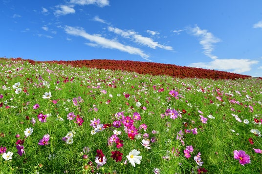 「みはらしの丘」では、約236万本のコスモスが現在見頃(7分咲き)を迎えています。コスモスはキク科コスモス属で、メキシコの高地原産の一年草。和名の「秋桜」は、サクラの花に似ることに由来します。丘のふもとを華やかに彩る“赤・白・ピンク”のコスモスと、丘一面を紅葉で赤く染めるコキアによる、秋の共演をお楽しみください。コスモスの見頃は10月31日頃まで続く見込みです。
