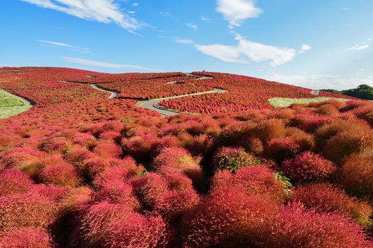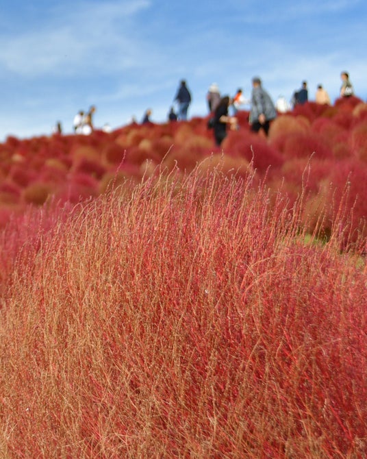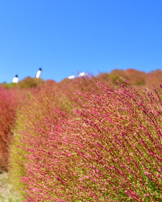 国営ひたち海浜公園の「みはらしの丘」では、昨年より約7千本多い約4万本のコキアが、10月18日より紅葉見頃を迎えました。見頃のピークは、26日頃まで続き、27日からは赤と茶のグラデーションをお楽しみいただける見込みです。丘一面を真っ赤に染め上げる光景は、当公園ならではの秋の風物詩。この場所でしか見ることのできない、秋の絶景をご堪能ください。