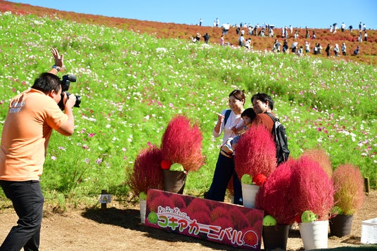 (4)フォトサービス(10/27まで)みはらしの丘第三頂上ふもとのコスモス前では、フォトサービスを実施しています。フォトスタッフが、紅葉見頃を迎えたコキアと一緒に記念撮影を行い、思い出づくりをお手伝いします。ご希望の方へは、オリジナルホルダー付き記念写真(有料)を販売しています。