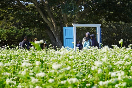 (2)花畑への入り口“扉”ソバ畑の美しい風景をさらに引き出すため、新たにフォトジェニックなスポットが登場しました。みはらしの丘を背景に、コキア・コスモス・ソバの華やかで美しい三重奏をお楽しみいただけます。花々に囲まれた空間で、まるでドアから出てきたような写真を撮影できます。ご来園の記念撮影にご利用いただけます。