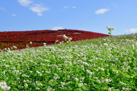 みはらしの丘のふもとに位置するみはらしの里では、ソバが見頃を迎えています。ソバはタデ科ソバ属で、中国原産の一年草。和名の「蕎麦」は、実の形が三角形(物の角=「稜(そば)」)をしていることに由来しています。白い小さな花を咲かせるソバは、茨城県のブランド「常陸秋そば」。近くには赤い花色が特徴の「高嶺ルビー」も植栽しています。ソバの見頃は10月31日頃まで続く見込みです。