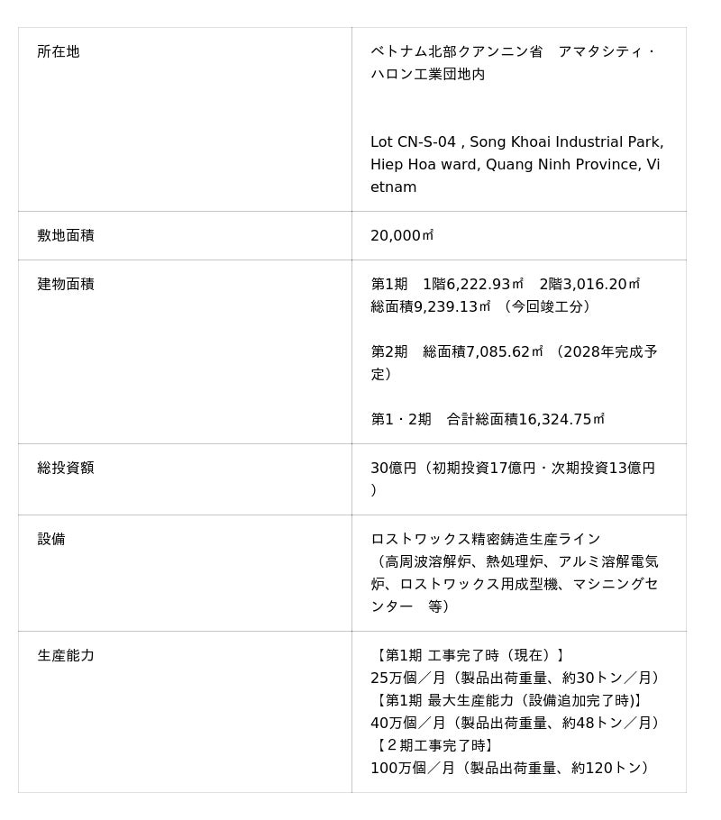 当社は、グループ全体の生産能力向上および納期短縮を目的に、主要事業であるロストワックス精密鋳造の新たな生産拠点として、今後も経済成長が見込まれるベトナムを選定しました。2023年に20,000平方メートル の用地を取得し、2024年7月に着工、2025年11月に現地の環境ライセンスを取得しました。現在は試作を進めており、2026年5月末までに量産を開始する予定としています。