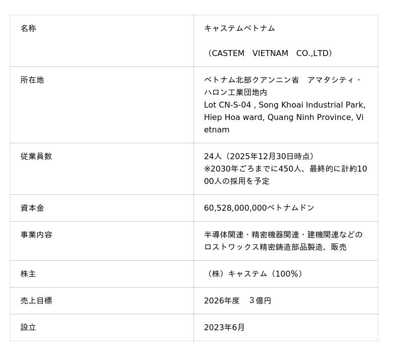 精密金属部品メーカーの株式会社キャステム(本社:広島県福山市、代表取締役社長:戸田拓夫)及びキャステムグローバルグループのキャステムベトナム(代表取締役社長:廣本智史)は、ベトナム北部クアンニン省に新設したベトナム工場の竣工式を2026年1月19日(月)に実施しました。キャステムグループのベトナム進出は今回が初めてとなります。本工場は7カ所目の海外生産拠点となり、今後予定される第2期工事を経て、グループ最大規模の生産拠点となる予定です。