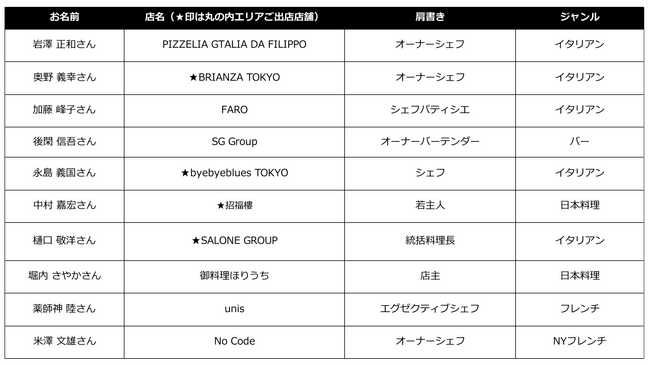 <新生「丸の内シェフズクラブ」メンバー 一覧(50音順)>