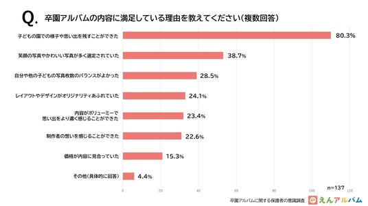 まず、8割以上の親が卒園アルバムに満足している理由に「子どもの園での様子や思い出を残すことができた」(80.3%)と回答しました。これは、アルバムが保護者にとって子どもの成長記録として重要な役割を果たしているということが言えます。また、「笑顔の写真やかわいい写真が多く選定されていた」(38.7%)ことも高評価の要因となっており、質の高い写真選定に保護者のニーズがあることが分かります。