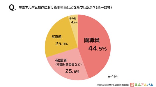 【結果4】卒園アルバム制作における主担当者はだれか聞いたところ、「園職員」が最も多く、44.5%を占めました。次いで、「保護者(卒園対策委員など)」が25.6%、「写真館」が25.0%とほぼ同数の結果となりました。