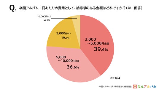 【結果11】卒園アルバム一冊あたりの費用として、納得感のある金額について聞いたところ、4割近い(39.6%)人が「3,000~5,000円」が納得できる価格帯と回答し、次いで僅差で「5,000~10,000円」(36.6%)という結果になりました。