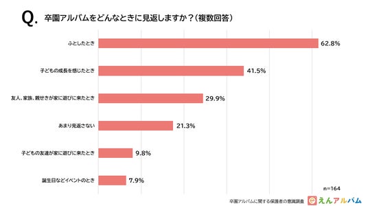 【結果6】卒園アルバムをどんなときに見返すか聞いたところ、「ふとしたとき」と答えた人が最も多く、62.8%に上りました。次いで「子どもの成長を感じたとき」(41.5%)、「友人、家族、親せきが家に遊びに来たとき」(29.9%)という結果になりました。