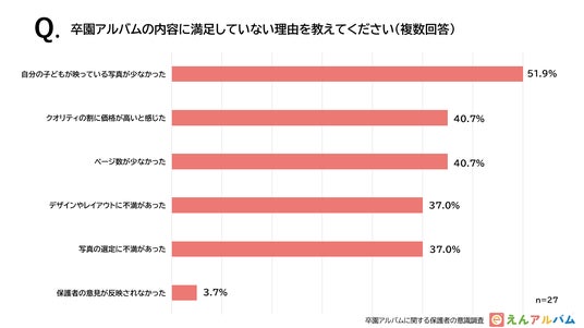・一方「不満」の理由は、「自分の子どもが映っている写真が少なかった」(51.9%)が半数を超え最も高く、次いで「クオリティの割に価格が高いと感じた」(40.7%)、「ページ数が少なかった」(40.7%)が同数の結果に。【結果3】