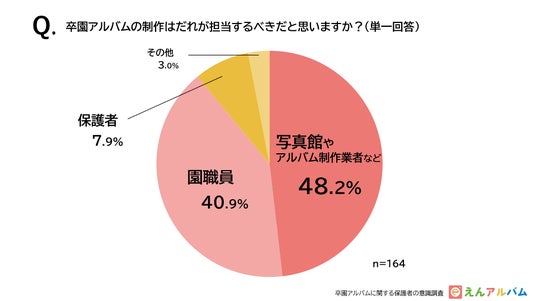 【結果5】卒園アルバムの制作はだれが担当すべきか聞いたところ、「写真館やアルバム制作業者など」と回答した人が最も多く、48.2%を占めました。次いで「園職員」が40.9%、「保護者」が7.9%という結果となりました。