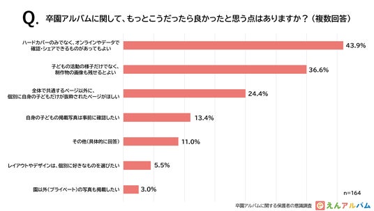 【結果10】卒園アルバムに関して、もっとこうだったら良かったと思う点を聞いたところ、43.9%の人が「ハードカバーのみでなく、オンラインやデータで確認・シェアできるものがあってもよい」と回答し、最も多い結果となりました。次いで、「子どもの活動の様子だけでなく、制作物の画像も残せるとよい」(36.6%)、「全体で共通するページ以外に、個別に自身の子どもだけが抜粋されたページがほしい」(24.4%)という回答が続きました。また、その他の自由回答では「担任以外のメッセージもあると嬉しかった」「卒園と同時に渡してほしい」などの意見がみられました。