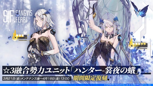強力な融合勢力ユニットを捕獲できる「捕獲作戦」にて、「3月21日(金)メンテナンス後」より過去の捕獲区域『SP721区域夜の回廊』が復刻し、★3ユニット「ハンター-裳夜の蛾」の捕獲が可能になります。