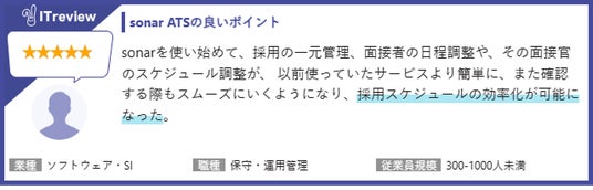 「sonar ATS」は、採用業務のデジタル化により、各種オペレーションの自動化やデータ分析による業務効率化を実現するサービスです。ユーザーの皆さまからは、以下のようなレビューをいただいています。