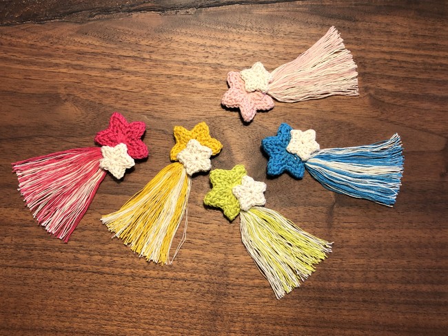 「MODE DE GALAXIE」は、”わりと正確な宇宙アクセサリー”の製作販売を行うブランドです。編み物を通して被災者の生きる力を育んできた「東北クロッシェ」の活動に感銘を受け、「流れ星のブローチ」「BONBONイヤリング」など一部商品の製作を依頼しています。