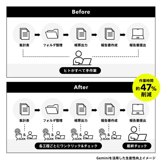 これにより、AML金融犯罪対策の特定業務において、従来は複数名の手作業で行っていた「集計表作成」「フォルダ整理」「帳票出力」「報告書作成」といった各工程において、RPAツール等も組み合わせ、「ワンクリック」の業務フローを実現し、一部工程においては、7時間の作業を5分に短縮。業務時間の大幅な削減(全体の作業時間の約47%削減)と、手作業によるヒューマンエラーの撲滅を同時に達成しました。