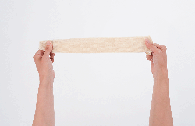 サポーターにおいて「固定力」はもちろん大事ですが、私たちは「フィットし馴染んでくれる感覚」というのも非常に重要だと考えました。幅約5.5cm、薄さ約0.5cmのゴム繊維はサポート感がありながらも、伸縮性に優れ、手首の凹凸にフィットするようになっています。