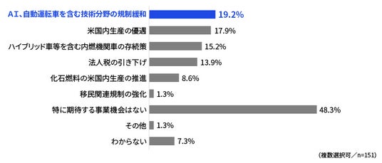 米国新政権で期待する事業機会のうち、最多はAI、自動運転車を含む技術分野の規制緩和で19.2%でした。トランプ大統領は規制緩和に関心が高く、市場が活性化するとの見立てがあることがうかがえます。