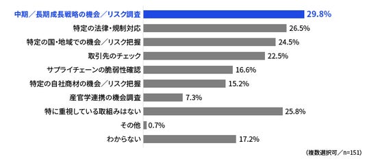 インテリジェンス活動として最も重視するのが中長期の成長戦略についての機会やリスク調査で、29.8%を占めました。直近の機会やリスクを見るだけでなく、長期的な視点を持とうとする企業の姿勢が垣間見えます。