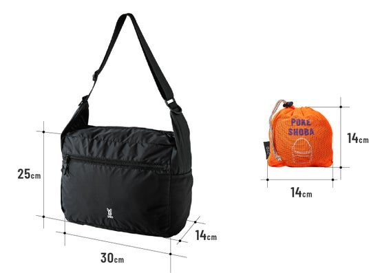 ショルダーバッグ「ポケショバ」 約150gの超軽量ながら見た目以上の約12Lという大容量確保したショルダーバッグ。 耐荷重7kgで2Lペットボトルを3本入れても安心の強度を誇ります。買い物時のエコバッグとしても、観光時のサブバッグとしても「これ一つで安心」なスペックです。