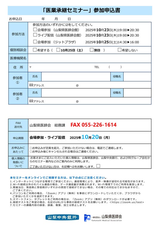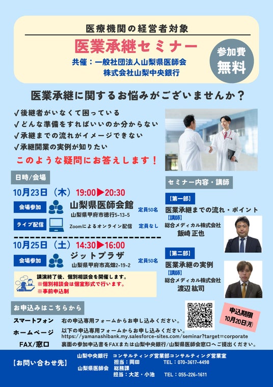 株式会社山梨中央銀行(頭取 古屋 賀章)は、医療機関(一般診療所)の経営者の皆さまを対象とした「医業承継セミナー」を開催します。