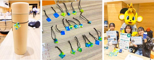 マイボトル用アクセサリー(写真:左、中央)と、ワークショップを実施した学生メンバー(写真:右)
