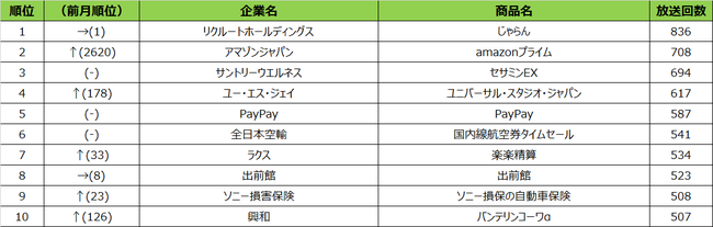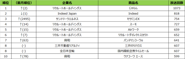 リクルートホールディングス「じゃらん」(東京・大坂・札幌1位、福岡2位、名古屋3位)や、全日本空輸「国内線航空券タイムセール」(東京8位、大坂6位)、ユー・エス・ジェイ「ユニバーサル・スタジオ・ジャパン」(大坂4位、名古屋10位)など、各エリアで旅行や観光系のCMが多く放送され、日常が取り戻された世の中が写し出されています。