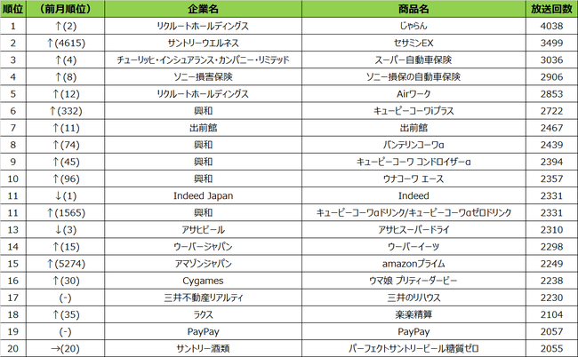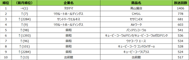 興和は毎月ランクインしていますが、6月度では企業別のCM放送回数ランキング(6月度)で1位となりました。その放送回数の総計は15356回となり、2位のリクルートホールディングスの14310回に1000回近くの差を付けています。また、ランクインした興和の5つのCMのうち、10位の「ウナコーワ エース」以外のCMは2020年から2021年の間に初出稿され、長く放送されているCMになります。