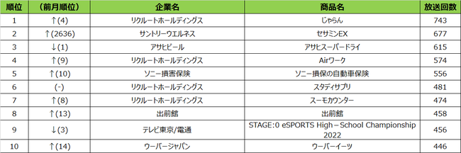 2022年6月度 商品別テレビCM放送回数(全国地上波25局、BS放送6局合計)