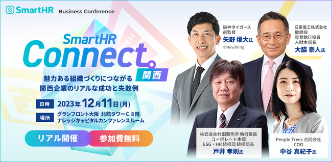 クラウド人事労務ソフト「SmartHR(スマートエイチアール)」を運営する株式会社SmartHR(本社:東京都港区、代表取締役CEO:芹澤 雅人)は、「SmartHR Connect 関西 ~魅力ある組織づくりにつながる 関西企業のリアルな成功と失敗例~」(以下「本イベント」)を2023年12月11日(月)にグランフロント大阪 ナレッジキャピタルカンファレンスルームにて開催いたします。