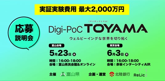 日本企業の新規事業開発やイノベーション創出を支援する事業共創カンパニーである株式会社Relic(本社:東京都渋谷区、代表取締役CEO:北嶋貴朗、以下、Relic)は、富山県が実施している、実証事業の伴走や事業拡大に向けたコミュニティづくりを支援する「Digi-PoC TOYAMA(デジポックとやま)」の令和6年度運営事業者へ採択されたことをお知らせします。