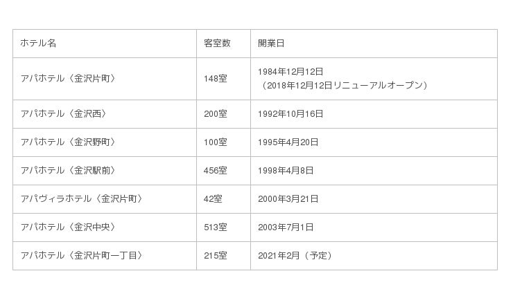 金沢市内のアパホテルは、1984年にアパグループ第一号ホテルとして開業したアパホテル〈金沢片町〉(全148室・2018年12月12日にリニューアルオープン)や北陸最大級の客室数を誇るアパホテル〈金沢中央〉(全513室)をはじめ、全6棟・1,459室を営業中であり、当計画を含め金沢市内のアパホテルは全7棟・1,674室となる。