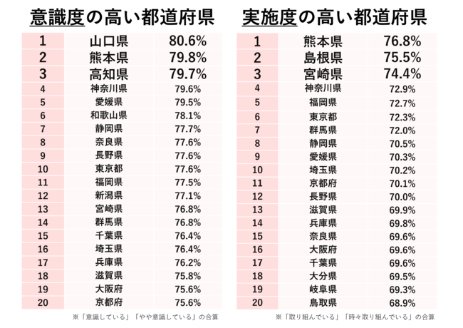 東日本エリアでは首都圏が多く、意識度では上位20位にランクインした東日本8都県のうち首都圏が5都県(神奈川県、東京都、群馬県、千葉県、埼玉県)、実施度では7都県のうち5都県(神奈川県、東京都、群馬県、埼玉県、千葉県)でした。東日本のトップは共に神奈川県で、どちらも4位でした。