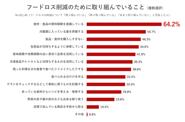 続いて、フードロス削減の取り組みをしている人を対象に、実際に何に取り組んでいるのかを聞きました。1位は「食材・食品の賞味期限を意識している」の64.2%で、2位と10ポイント以上の差をつけトップになりました。2位は「冷蔵庫に入っている量を把握する」の50.7%、3位は「食品・食材を購入しすぎない」の46.3%となりました。