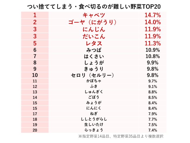 「つい捨ててしまう・食べ切るのが難しい食品・食材」の中で1位になった「野菜・果物」について、さらに具体的に聞きました。農林水産省が定めた指定野菜14品目、指定野菜に準ずる重要な野菜として定められた特定野菜35品目の中から、「つい捨ててしまう・食べ切るのが難しい野菜」を複数選択で聞きました。結果は、1位から順に「キャベツ」14.7%、「ゴーヤ(にがうり)」14.0%、「にんじん」11.9%、「だいこん」11.9%となりました。