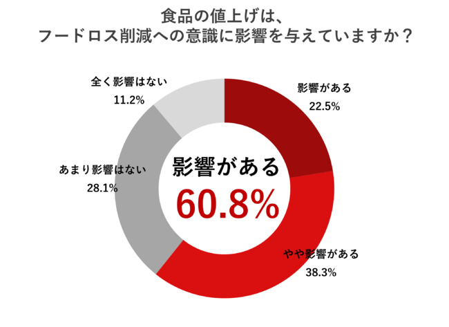 原材料・原油価格の高騰やロシアによるウクライナ侵攻、急激な円安などさまざまな要因で食品の値上げラッシュが続いていますが、この「食品の値上げ」がフードロス削減への意識に影響を与えているかを聞きました。すると「影響がある」が22.5%、「やや影響がある」が38.3%で、合わせて60.8%が影響があると回答しました。食品の値上げは、フードロス削減の意識に大きな影響を与えていることがわかります。