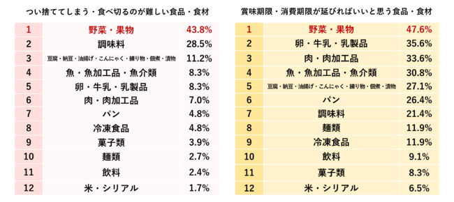 ・フードロスしがちなもの、期限が延びて欲しいもの、共に「野菜・果物」が1位