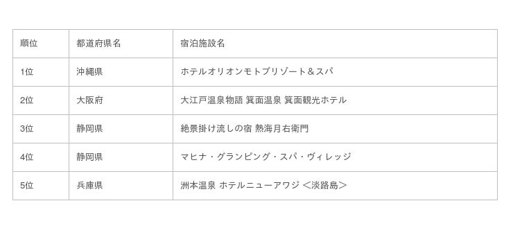 1位の沖縄県本島北部に位置する「ホテルオリオンモトブリゾート&スパ」は、県内でも珍しい礁湖内にある「エメラルドビーチ」が目の前に広がっており、全客室から真っ白な珊瑚砂と透明度の高いコバルトブルーの海を堪能することができます。また、地下1,500mから汲み上げた温泉が楽しめる半露天風呂や、テラス席を併設したロビーラウンジからも、海が眼下に広がる絶景を楽しむことができます。宿泊者からは「伊江島が見渡せるオーシャンビューに感動しました。とてもキレイで現実逃避でき、くつろげました。」「オーシャンビューが気持ちよく、波の音が心地よかったです。」など眺望に関するクチコミが寄せられ、高い評価を得ています。また沖縄県からの宿泊人泊数が前年同期比+368.9%(約4.7倍)に増えていることから、県民からの人気の高さも伺えます。